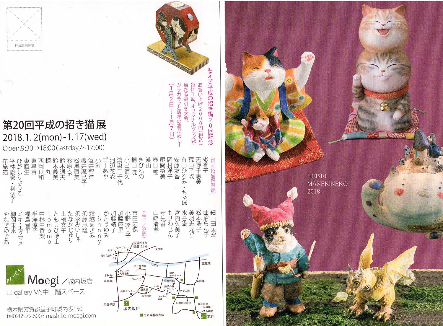 | ◆もえぎ城内坂店 第18回「平成の招き猫」◆ 時:2018年1月2日(火)〜17日(水) 9:30〜18:00(最終日17:00まで) 所:もえぎ城内坂店2FギャラリーM’S 〒321-4217 栃木県芳賀郡益子町城内坂150 Tel 0285-72-6003 「もえぎ」は焼物の町益子で多くの陶・クラフト作家のみなさんの発表の場として 親しまれているギャラリーです♪ ※クリックすると大きな画像でご覧いただけます。 ※お陰様で終了しました、来場下さいました方有り難うございました。 |