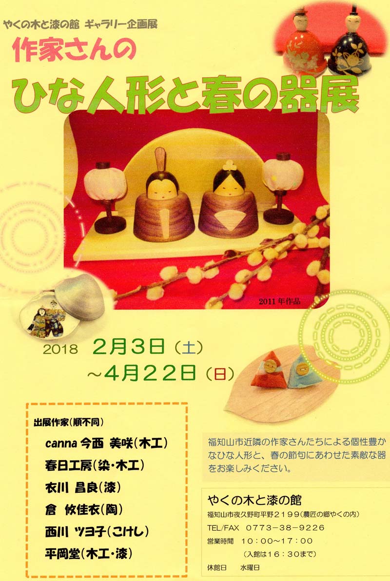| ◆作家さんの雛人形と春の器展◆ 時:2018年2月3日(土)〜4月22日(日) 所:やくの木と漆の館 ギャラリースペース 〒629-1322 京都府福知山市夜久野町平野2199 TEL/FAX 0773-38-9226 毎年恒例の地元夜久野町での企画展。 今年は特に期間が長いので温泉やお花見のついでに是非お立ち寄りください。 展覧会だけを見る場合は入館料は無料です♪ ※クリックすると大きな画像でご覧いただけます。 ※お陰様で終了しました、来場下さいました方有り難うございました。 |