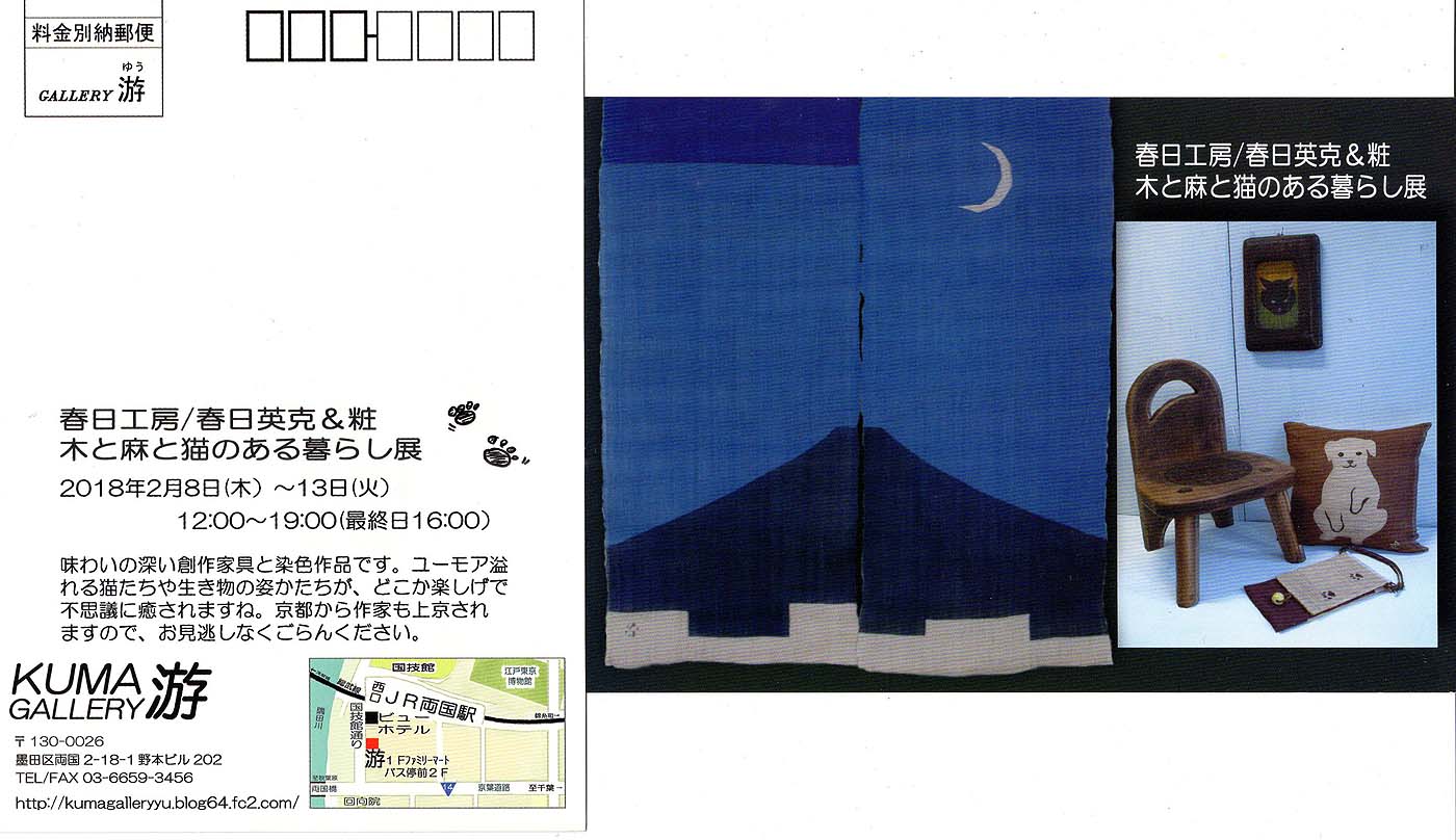 | ◆春日工房「木と麻と猫のある暮らし展」◆ 時:2018年2月8日(木)〜13日(火) 12:00〜19:00(最終日16:00まで) 所:KUMA-GALLERY游 〒130-0026 東京都墨田区両国2-18-1 野本ビル202号 Tel・Fax 03-6659-3456 一昨年、ギャラリーが遠くに転居するので最後の展示をさせて頂いたつもりだったのですが 嬉しいことに転居が取りやめになったために、また同じ両国でやらせていただきます。 気さくなオーナー「くまさん」とのおしゃべりも楽しみに、是非お出かけください。 ※クリックすると大きな画像でご覧いただけます。 ※お陰様で終了しました、来場下さいました方有り難うございました。 |
