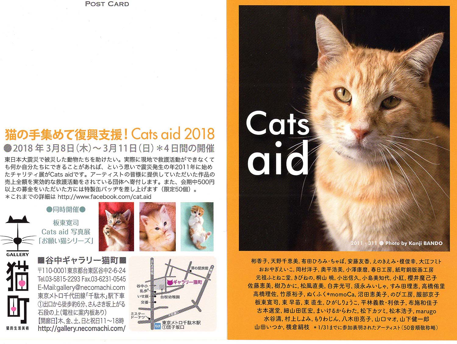 | ◆猫の手集めて復興支援!CATS AID 2017◆ 時:2018年3月8日(木)〜11日(日) 11.00〜18:00 所:ギャラリー猫町 〒110-0001東京都台東区谷中 2-6-24 03-5815-2293 cats aid フェイスブックページ 東日本大震災の翌年から毎年開かれているチャリティ展覧会です。 売上のすべては被災した動物たちの支援のために寄付されます。 ※クリックすると大きな画像でご覧いただけます。 ※お陰様で終了しました、来場下さいました方有り難うございました。 |