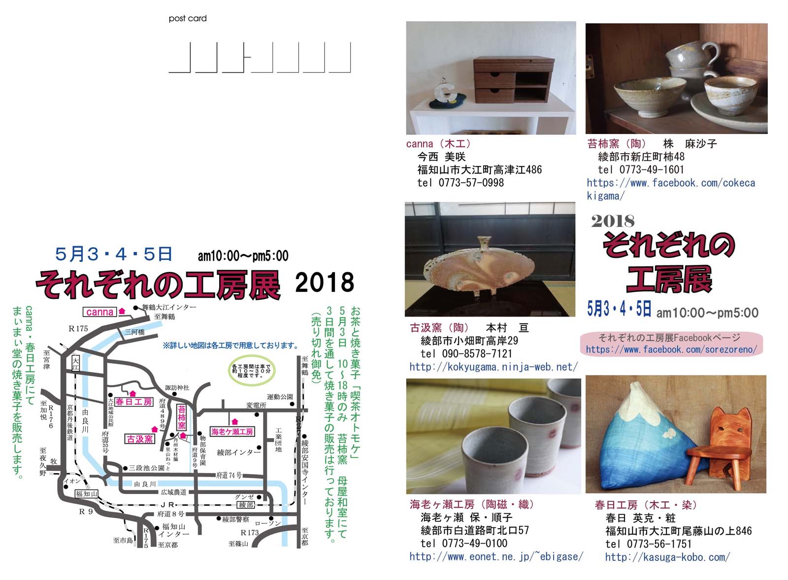| ◆それぞれの工房展◆ 時:2018年5月3日(祝)〜5日(祝) 10:00〜17:00 所:春日工房自宅ほか合計5か所 年に一度のそれぞれの自宅で開かれる展覧会。 今年は京都府福知山市2か所、綾部市3か所で開かれます。 新緑の季節にドライブがてら是非里山の工房巡りにいらして下さい♪ それぞれの工房展のFacebookページ ※クリックすると大きな画像でご覧いただけます。 ★詳しい地図は以下のリンクからご覧ください。 ![]() ※クリックするとpdfファイル(約785KB)で開きます。 ※お陰様で終了しました、来場下さいました方有り難うございました。 |