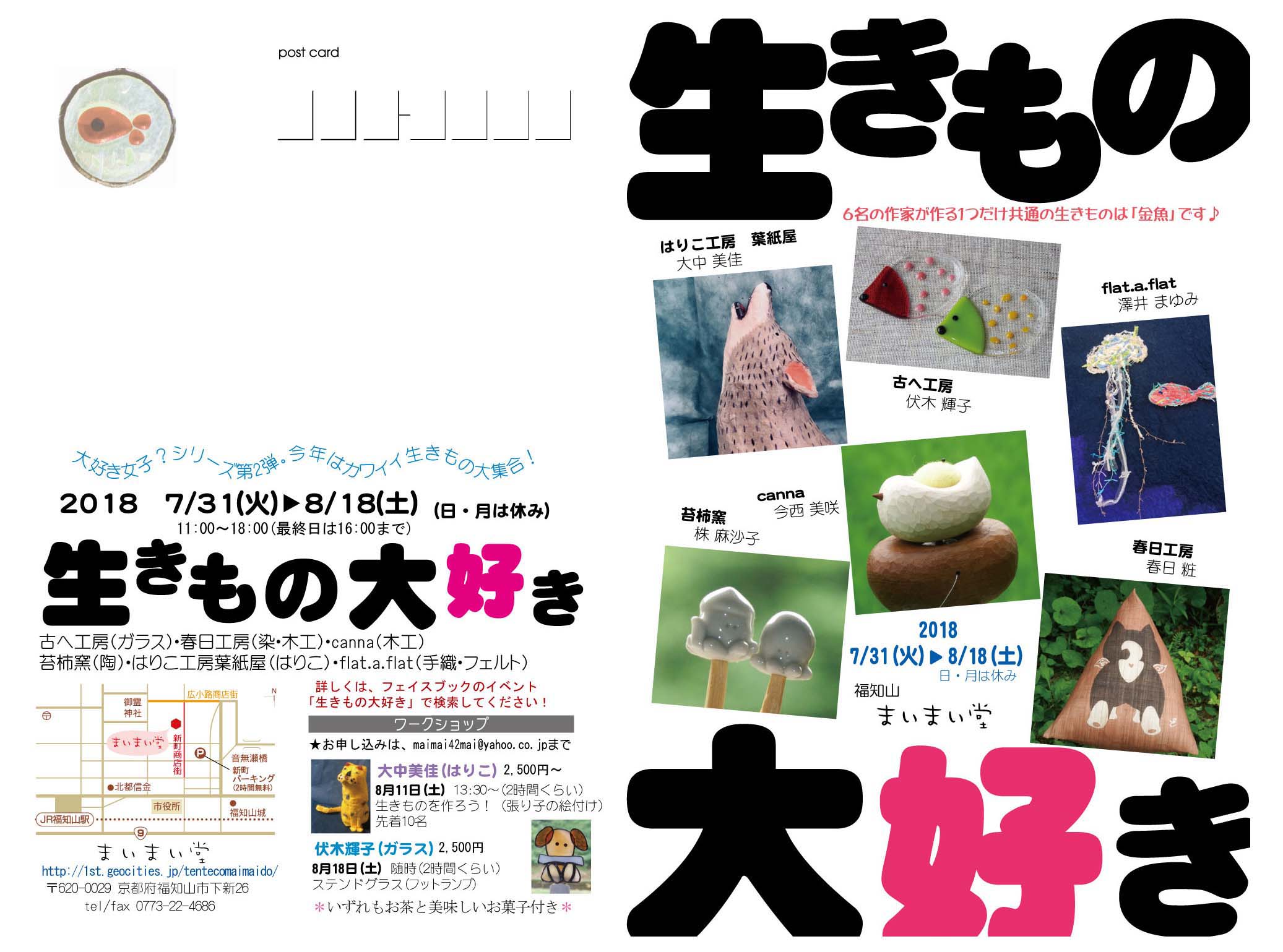 | ◆生きもの大好き◆ 時:2018年7月26日(火)〜8月18日(土) (日・月曜日は休み) 所:まぃまぃ堂 京都府福知山市下新26 TEL 0773-22-4686 canna (今西美咲) 木工 苔柿窯 (株麻沙子) 陶 flat.a.flat (澤井まゆみ) 織・フェルト 古へ工房 (伏木輝子) ガラス 春日工房 (春日粧) 染色・木工 はりこ工房 葉紙屋(大中美佳) はりこ ※クリックすると大きな画像でご覧いただけます。 昨年好評だった?「富士山だい好き」に続く大好きシリーズ第二弾! 生きているもの全般・・哺乳類に限らず鳥類・魚類・爬虫類など、 何でも大好き♪という気持ちを表現します。 昨年より多いジャンルの異なる女性作家6名でのにぎやか展覧会を お楽しみください! ※お陰様で終了しました、来場下さいました方有り難うございました。 |