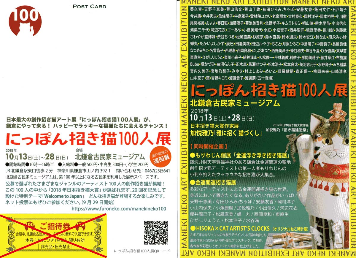 | ◆にっぽん招き猫100人展◆ 時:2018年10月13日(土)〜10月28日(日) 10:00〜16:30 会期中無休 所:北鎌倉古民家ミュージアム(旧 鎌倉古陶美術館) 〒247-0062 神奈川県鎌倉市山ノ内392-1 TEL. 0467(25)5641 FAX. 0467(24)8848 (JR北鎌倉駅下車 徒歩2分) 入館料 一般 500円 中高生 300円 小学生 200円 瀬戸で開催された、「にっぽん招き猫100人展」が関東北鎌倉でご覧いただけます。 100人のアーティストによる迫力ある作品をぜひご覧ください。 ●招き猫100人展のHPへリンク (ネット投票も出来ます。) ※クリックすると大きな画像でご覧頂けます。 ※お陰様で終了しました、来場下さいました方有り難うございました。 |