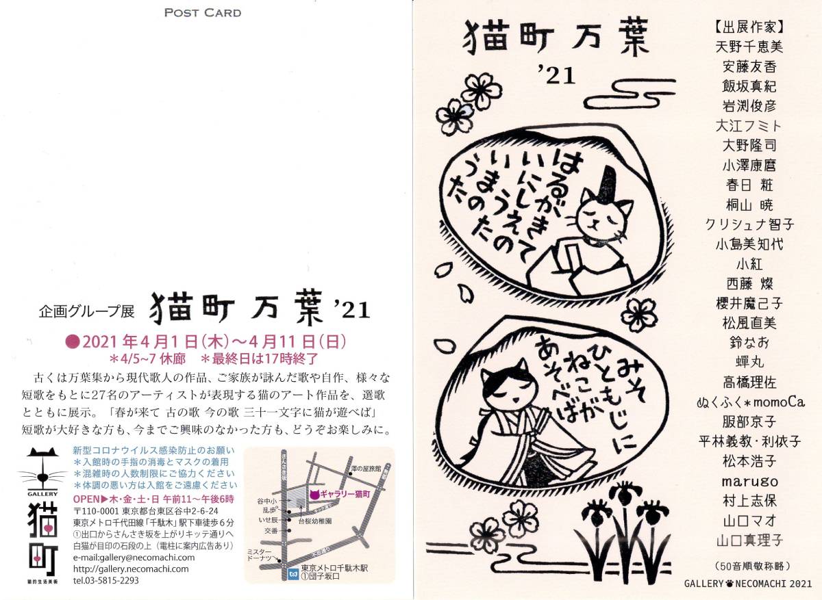 | ◆グループ企画展・猫町万葉◆ 時:2021年4月1日(木)〜4月10日(日) 4/5〜7は休廊 11:00〜18:00(最終日17時まで) 所:ギャラリー猫町 〒110-0001東京都台東区谷中 2-6-24 03-5815-2293 作家が「短歌」を選歌して、その短歌にちなんだ内容を猫で表現した作品を 作るグループ展です。 ※クリックすると大きな画像でご覧いただけます。 ※お陰様で終了しました、来場下さいました方有り難うございました。 |