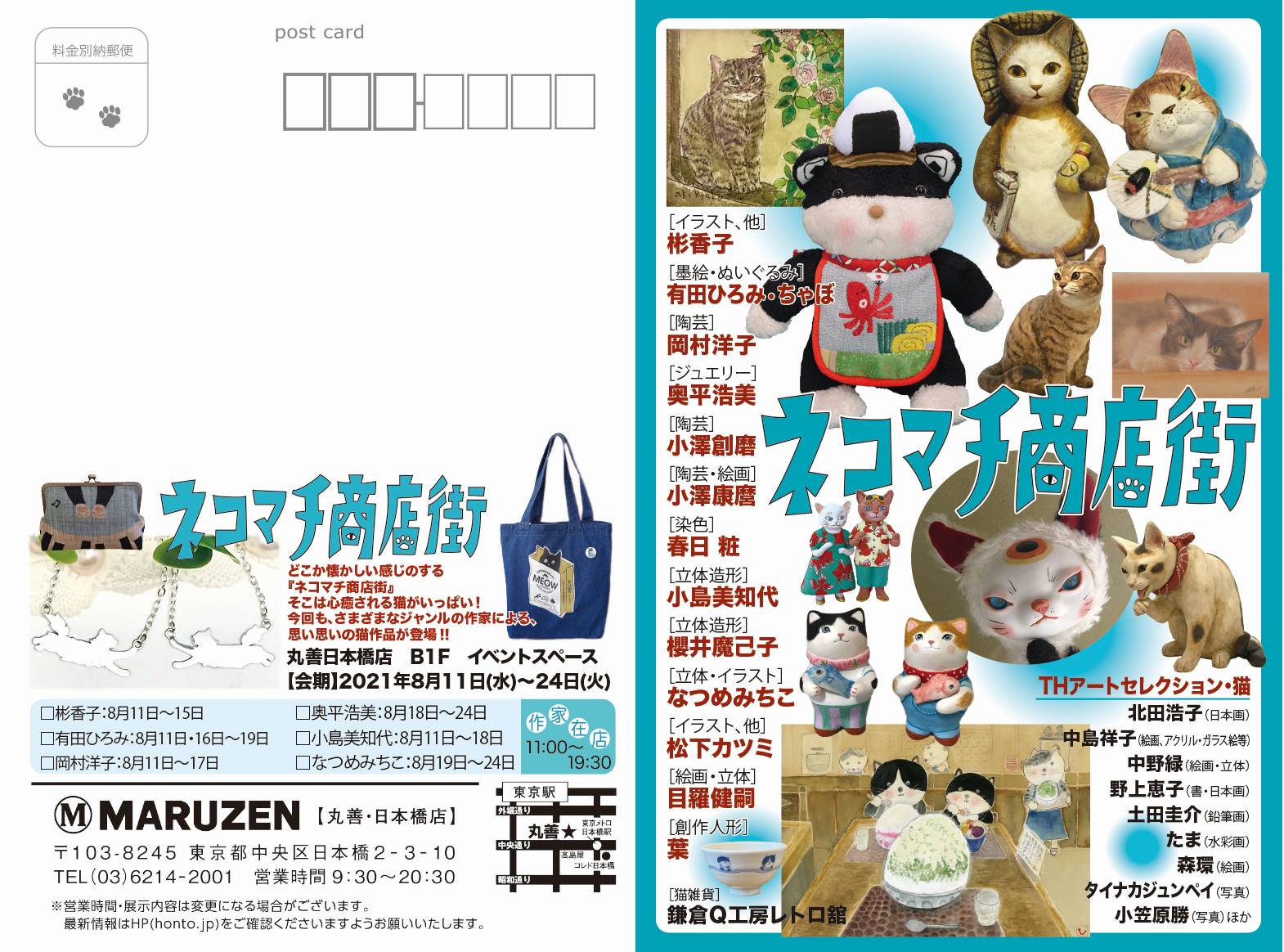 | ◆ネコマチ商店街◆ 時:2021年8月11日(水)〜24日(火) 営業時間 9:30〜20:30 所:丸善日本橋店 B1F イベントスペース 〒103-8245 東京都中央区日本橋2-3-10 TEL 03-6241-2001 様々なジャンルの作家がそれぞれに作る猫。 そんな猫だらけの「ネコマチ商店街」というグループ展です。 丸善・日本橋の涼しい地下にある商店街をお楽しみください♪ ※クリックすると大きな画像でご覧いただけます。 ※お陰様で終了しました、来場下さいました方有り難うございました。 |