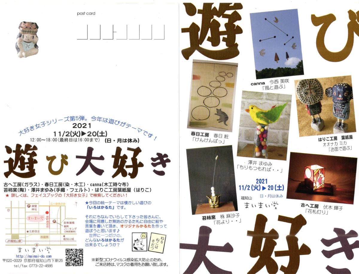 | ◆遊び大好き◆「大好き女子」第5弾 時:2021年11月2日(火)〜11月20日(土) (日・月曜日は休み) 所:まぃまぃ堂 京都府福知山市下新26 TEL 0773-22-4686 様々なジャンルの女性作家ばかり6名で催している「大好きシリーズ」 コロナにも負けずに今年も開催します!(しっかり感染防止対策をします!) 今年のテーマはみんな大好き「遊び大好き」 そして一人一点ずつ制作する統一テーマは「いろはかるた」です。 さて今年はどんな楽しい作品が集まるでしょうか? ★時節柄ワークショップは行いませんが、代わりにお客様も作家も みんなで遊べる楽しい企画を考え中です。(決まり次第発表します) canna (今西美咲) 木工・布物 苔柿窯 (株麻沙子) 陶 flat.a.flat (澤井まゆみ) 織・フェルト 古へ工房 (伏木輝子) ガラス 春日工房 (春日粧) 染色・木工 はりこ工房 葉紙屋(オオナカミカ) はりこ 「大好き女子」フェイスブックページ ※クリックすると大きな画像でご覧いただけます。 ※お陰様で終了しました、来場下さいました方有り難うございました。 |