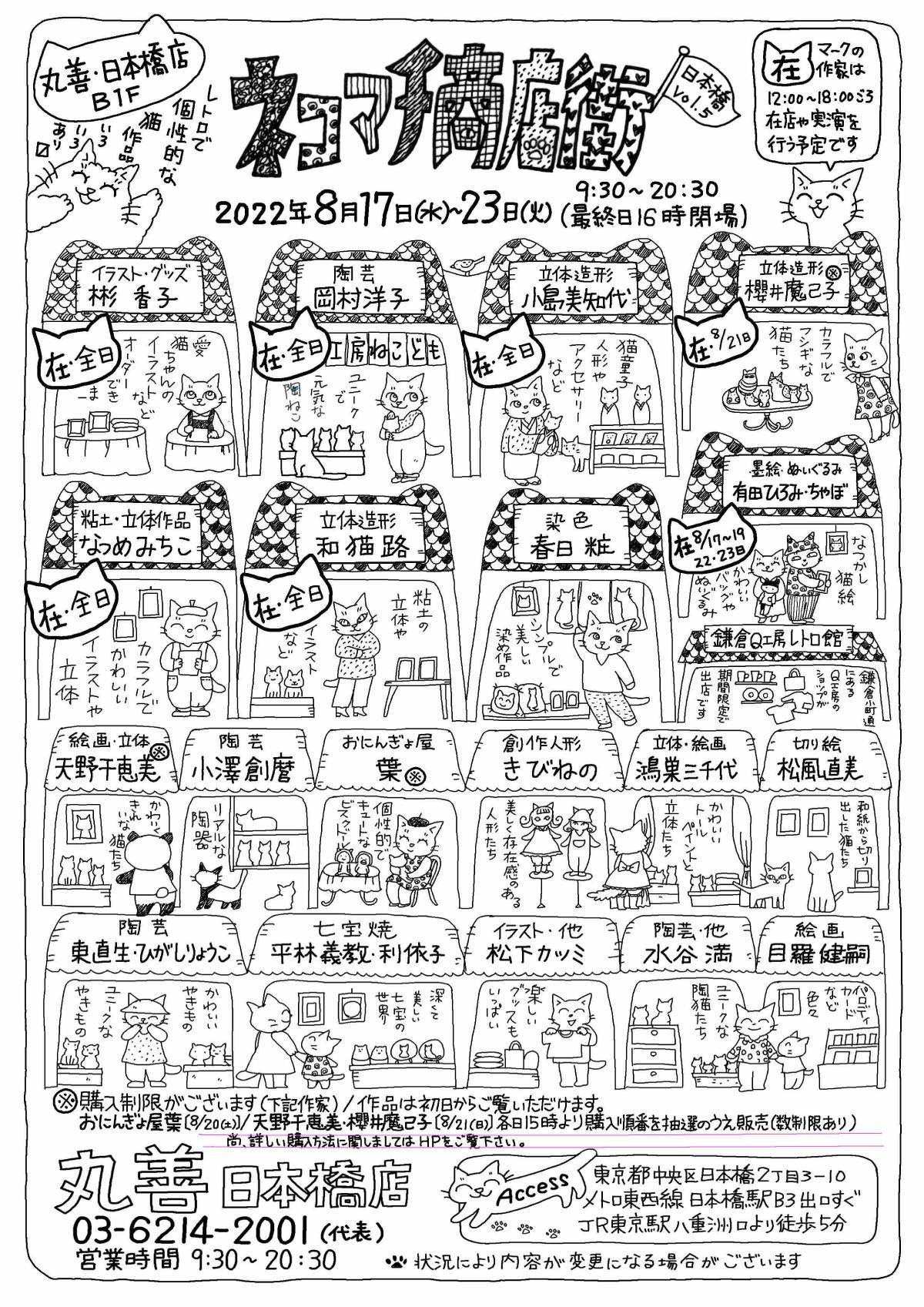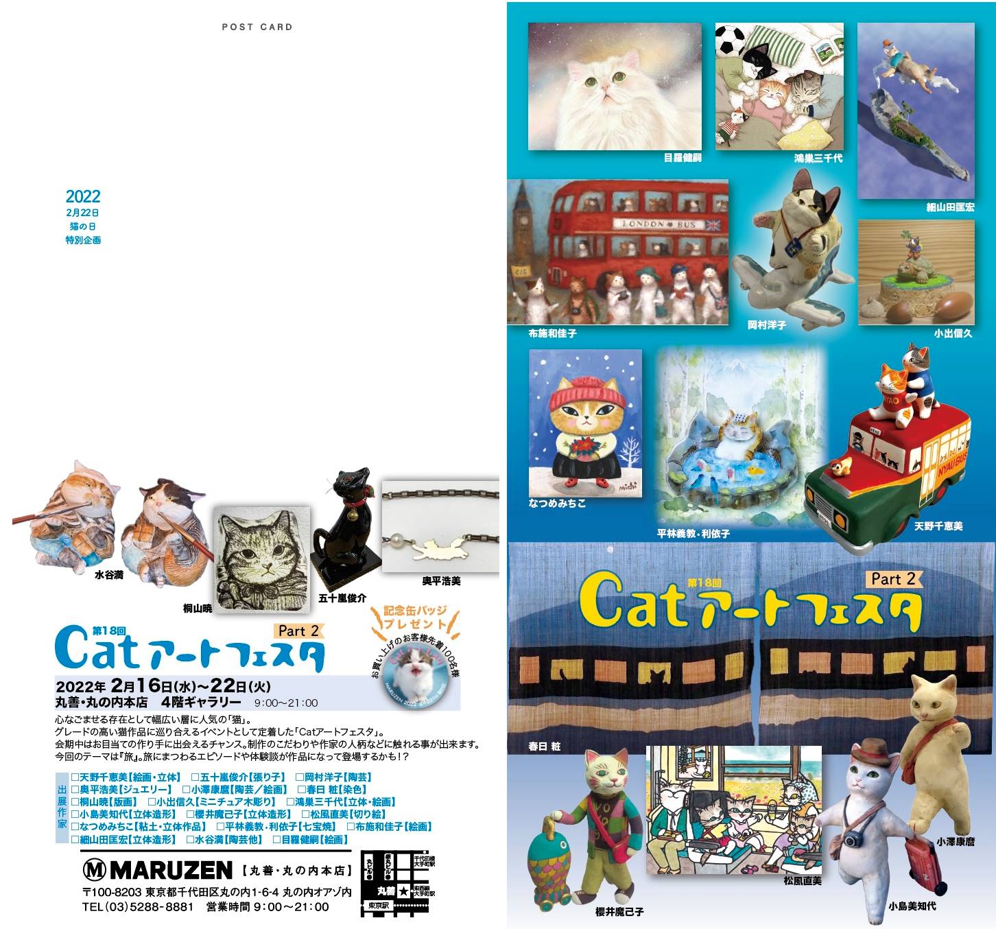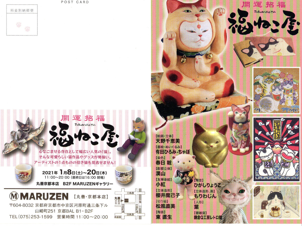 | ◆丸猫展2022winter 第18回 Cat アートフェスタ◆ 時:2022年2月9日(水)〜22日(火) 9:00〜21:00(最終日は16時まで) ★春日粧の参加は16日(水)から22日(火)までです。 ※2月20日(日)はビルメンテナンスの為休業 所:丸善丸の内本店 4Fギャラリー 東京都千代田区丸の内1-6-4 丸の内オアゾ 1〜4F 丸善 東京駅を出てすぐのところにある丸の内オアゾの中の 素敵なギャラリースペースでのグループ展です。 素晴らしい作品を作られる素敵な作家さんたちにまじって 今回初めて参加させてもらえるのでドキドキワクワクしています♪ ※クリックすると大きな画像でご覧いただけます。 ![]() ※クリックするとpdfファイル(2ページ・約2.12MB)が開きます。 ※お陰様で終了しました、来場下さいました方有り難うございました。 |