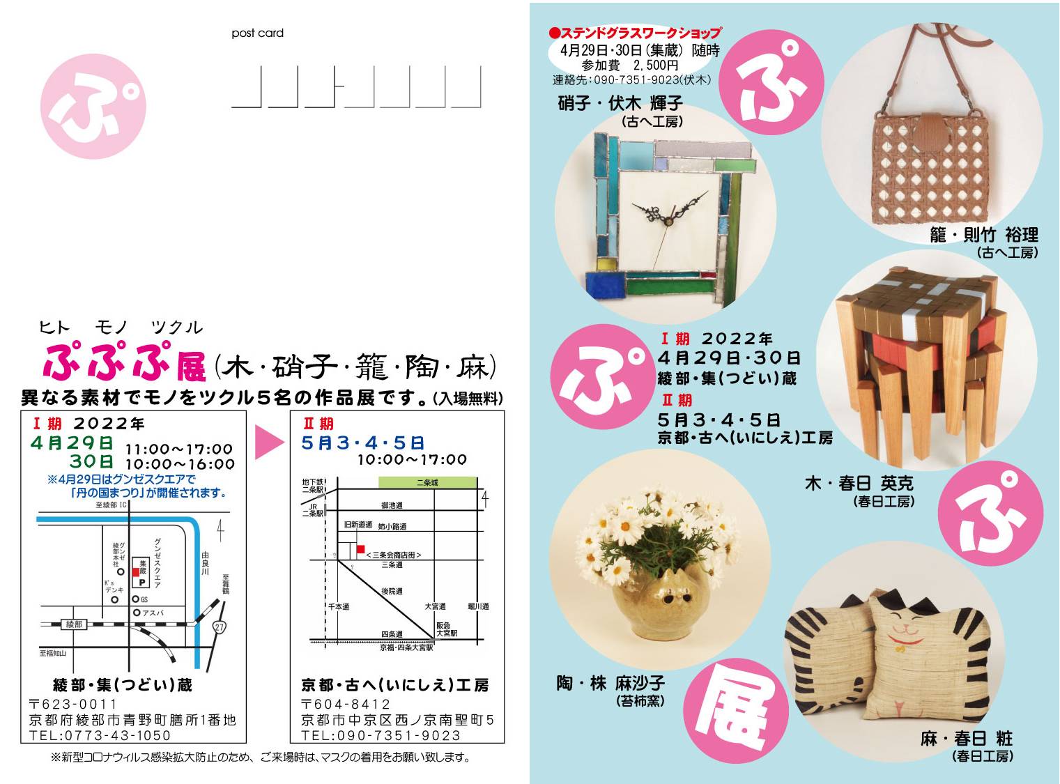 | ◆ヒト モノ ツクル ぷぷぷ展(木・硝子・籠・陶・麻)◆ T期 時:2022年4月29・30日 29日 11:00〜17:00 30日 10:00〜16:00 所:綾部・集(つどい)蔵(グンゼスクエア) 〒623-0011 京都府綾部市青野町膳所1番地 TEL:0773-43-1050 U期 時:2022年5月3・4・5日 10:00〜17:00 所:京都・古へ(いにしえ)工房 〒604-8412 京都市中京区西ノ京南聖町5 TEL:090-7351-9023 異なる素材でモノをツクル5名の作品展です。 木:春日英克(春日工房) 硝子:伏木輝子(古へ工房) 籠:則竹裕理(古へ工房) 陶:株麻沙子(苔柿窯) 麻:春日粧(春日工房) 会期が2期、それに伴い会場も2か所に分かれての開催ですので どちらでもご都合の良い時と会場にお越しください♪ コロナ禍や戦争で明るいとは言えない世の中ですが せめて心は楽しく「ぷぷぷ」と和める空間を作るつもりですので 是非お気軽にお立ち寄りくださいませ! ★綾部会場ではステンドグラスのワークショップも開きます。 ※クリックすると大きな画像でご覧いただけます。 ※お陰様で終了しました、来場下さいました方有り難うございました。 |