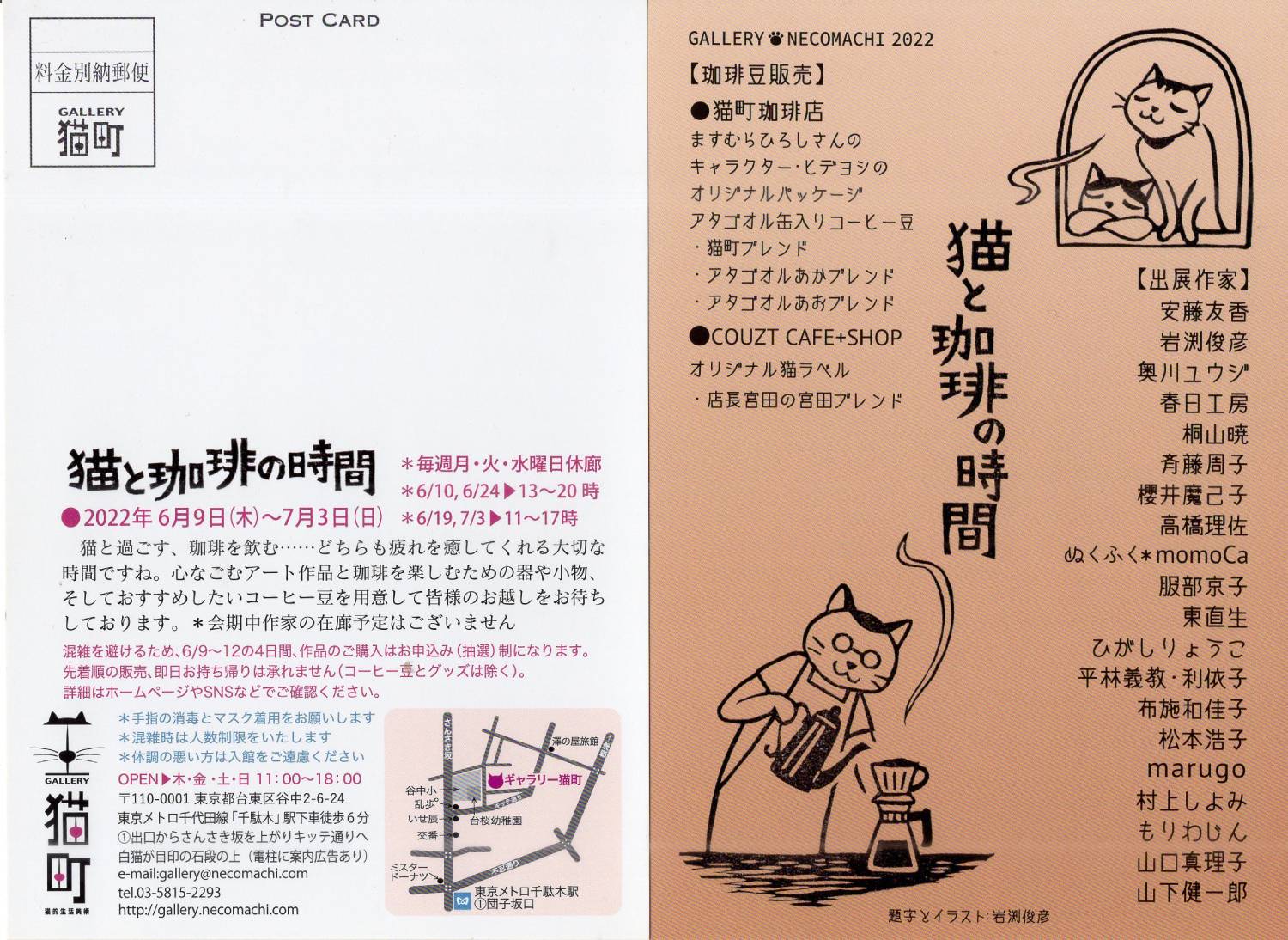 | ◆猫と珈琲の時間◆ 時:2022年6月9日(木)〜7月3日(日) 毎週月・火・水曜日休廊 11〜18時 ※6/10,6/24?13〜20時※6/19、7/3?11〜17時 所:ギャラリー猫町 〒110-0001東京都台東区谷中 2-6-24 03-5815-2293 猫と過ごす、珈琲を飲む・・・どちらも疲れを癒してくれる大切な時間ですね。 今年、新潟県村上市にopenした”猫町珈琲店”とのコラボで美味しい珈琲豆も 販売いたします。 春日工房は珈琲と猫を同時に楽しめる小物を見て頂く予定です。 会期の半分は春日工房展と重なりますので、是非ご覧くださいませ。 ※クリックすると大きな画像でご覧いただけます。 ※お陰様で終了しました、来場下さいました方有り難うございました。 |
