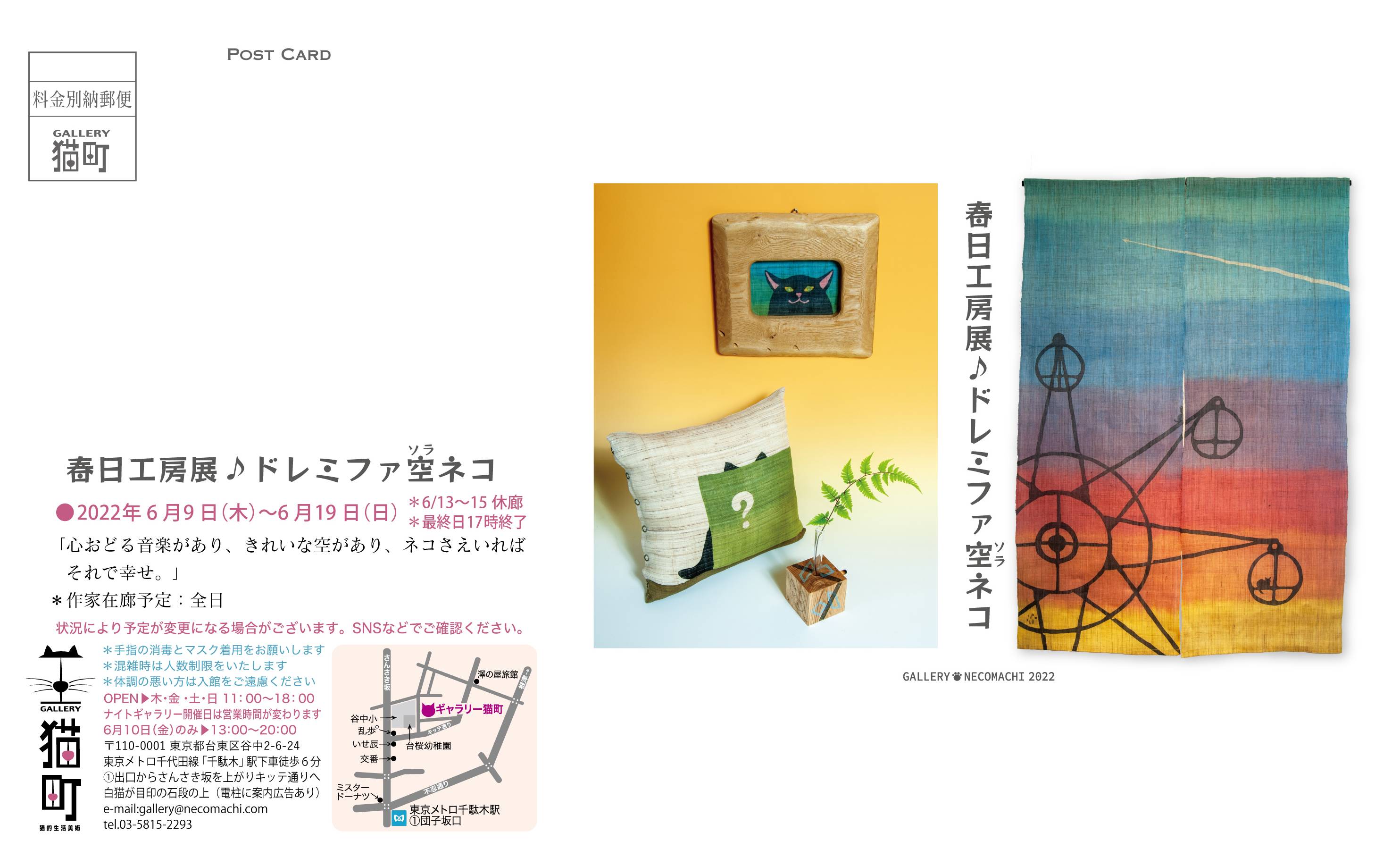 | ◆春日工房作品展 「ドレミファ空ネコ」◆ 心おどる音楽があり、きれいな空があり、ネコさえいればそれで幸せ。 時:2022年6月9日(木)〜19日(日) 6/13〜15休廊 11:00〜18:00(最終日17:00まで 所:ギャラリー猫町 〒110-0001東京都台東区谷中 2-6-24 03-5815-2293 東京・谷中の素敵な民家ギャラリーの「猫町」 昨年から毎年開催させていただくことになりました! 在廊日・・3年ぶりに上京する英克は初日のみ、粧は全日在廊します。 ※クリックすると大きな画像でご覧いただけます。 ※お陰様で終了しました、来場下さいました方有り難うございました。 |