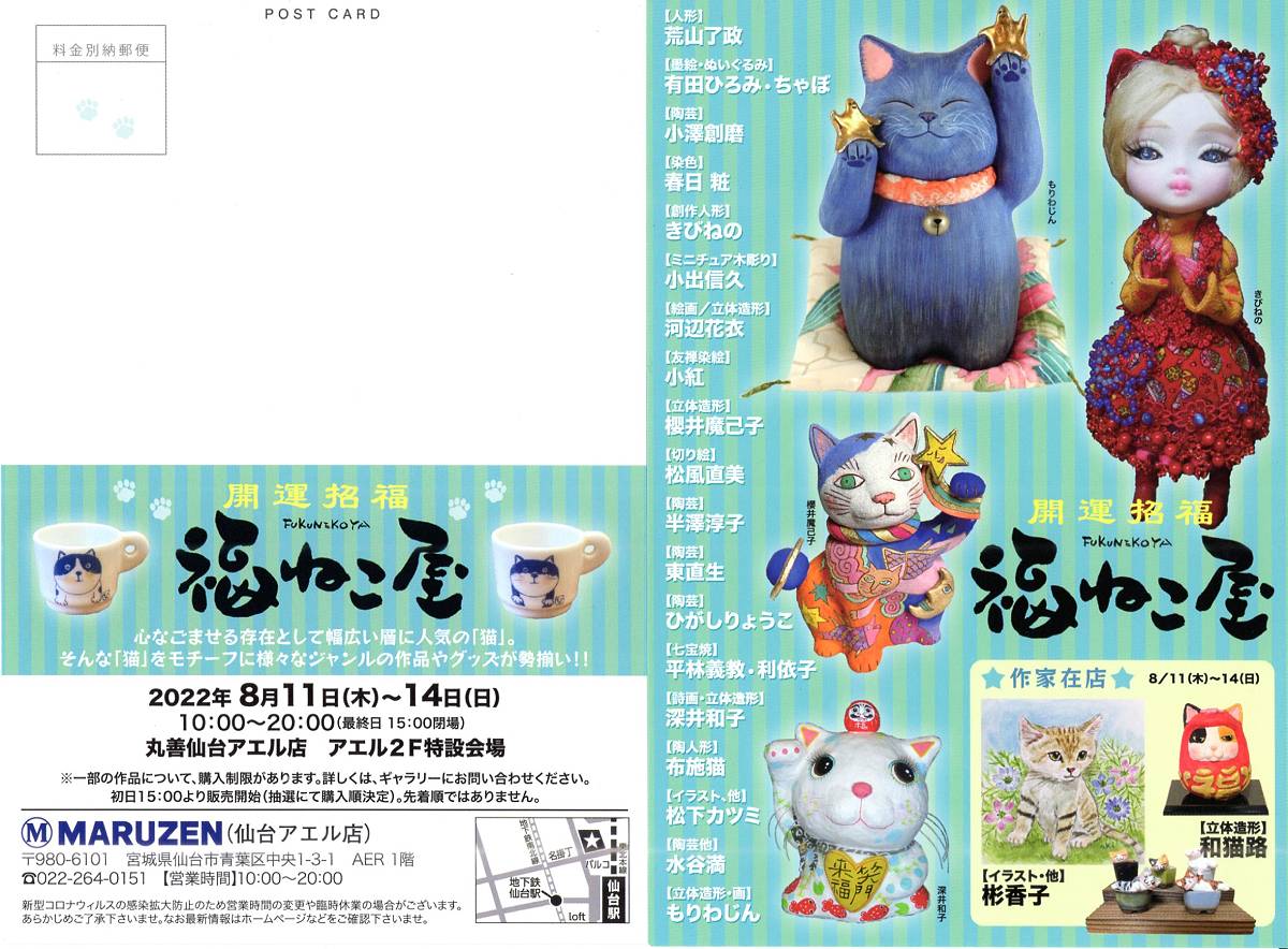 | ◆開運招福 福ねこ屋◆ 時:2022年8月11日(木)〜8月14日(日) 所:丸善仙台アエル店 アエル2F特設会場 〒980-6101 仙台市青葉区中央1-3-1 AER1 TEL:022-264-0151 FAX:022-264-0112 JR仙台駅 徒歩2分 仙台で開催されるの久しぶりです。 招き猫や猫の魅力的な作品が集合します♪ ◆クリックすると大きな画像でご覧いただけます。 ※お陰様で終了しました、来場下さいました方有り難うございました。 |