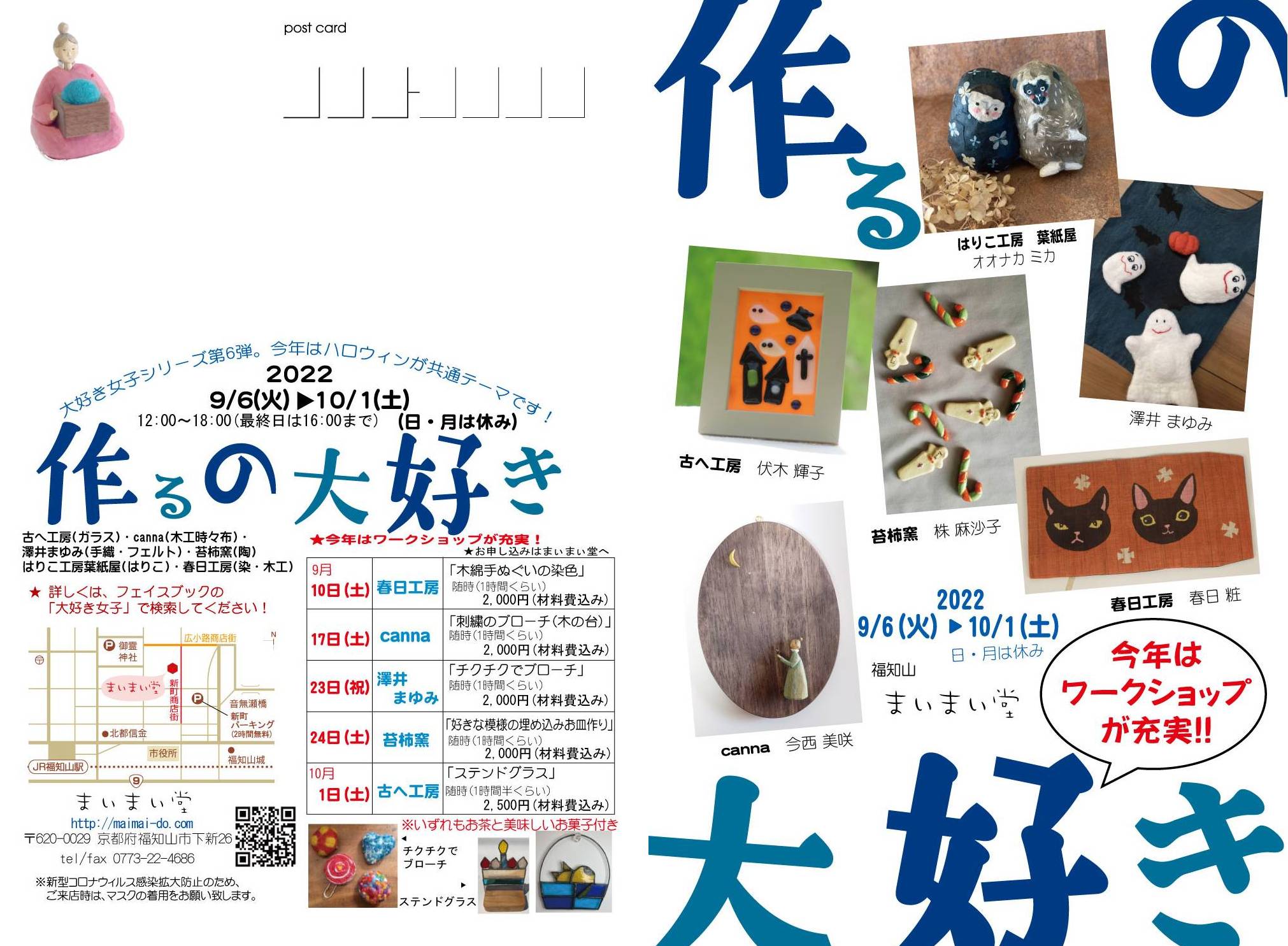 | ◆作るの大好き◆「大好き女子」第6弾 時:2022年9月6日(火)〜10月1日(土) (日・月曜日は休み) 所:まぃまぃ堂 京都府福知山市下新26 TEL 0773-22-4686 様々なジャンルの女性作家ばかり6名で催している「大好きシリーズ」 今年のテーマはき「作るの大好き」 そして一人一点ずつ制作する統一テーマは「ハロウィン」です。 ★今年は大きなテーマに沿ってワークショップを充実させましたので 是非作ることを楽しみにお出かけくださいませ♪ 古へ工房 (伏木輝子) ガラス canna (今西美咲) 木工・布物 苔柿窯 (株麻沙子) 陶 澤井まゆみ 織・フェルト はりこ工房 葉紙屋(オオナカミカ) はりこ 春日工房 (春日粧) 染色・木工 「大好き女子」フェイスブックページ ※クリックすると大きな画像でご覧いただけます。 ※お陰様で終了しました、来場下さいました方有り難うございました。 |
