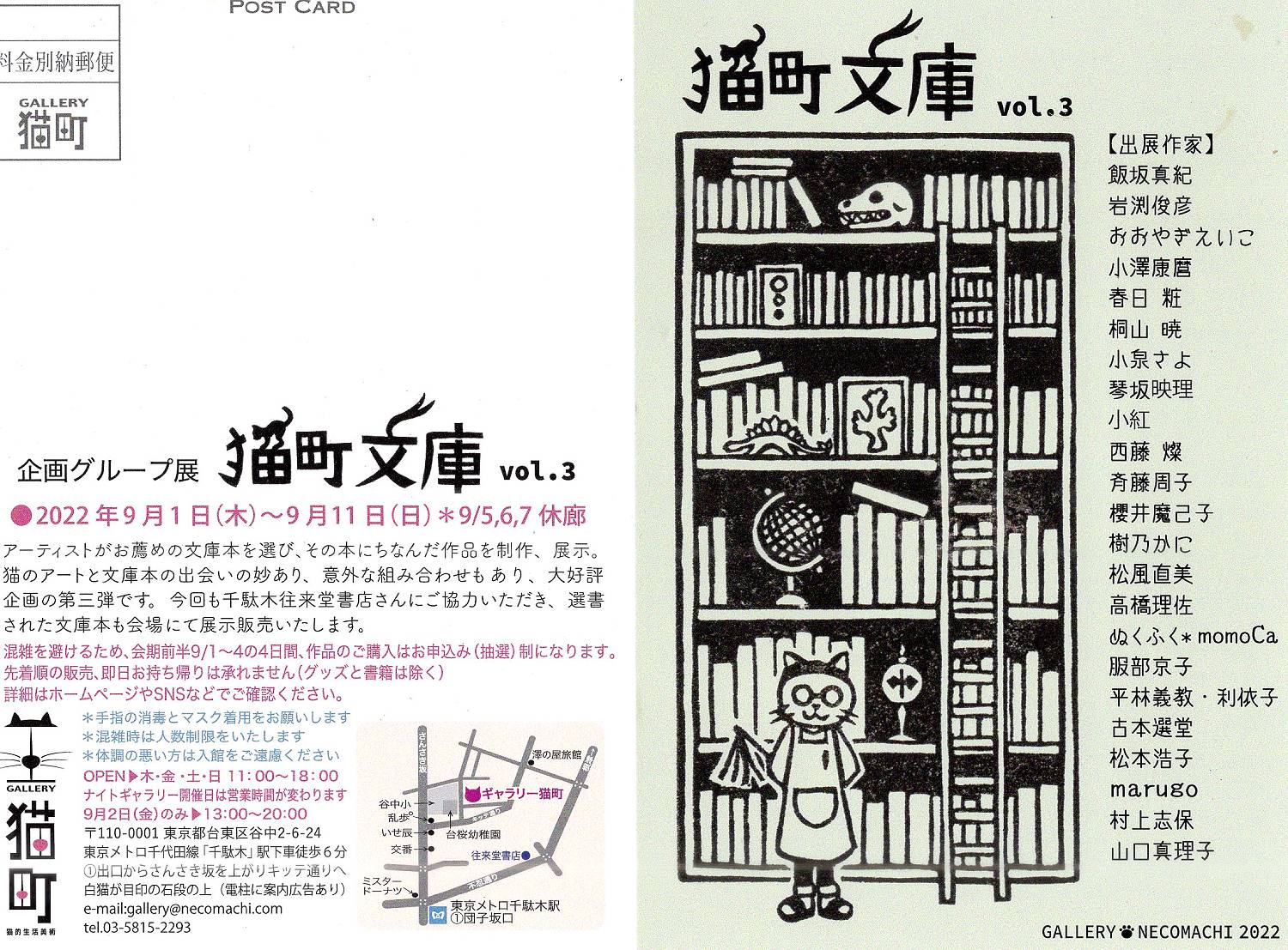 | ◆企画グループ展・猫町文庫vol.3◆ 時:2022年9月1日(木)〜9月11日(日) 7/5.・6・7は休廊 11:00〜18:00(9/2のみ13:00〜20:00) 所:ギャラリー猫町 〒110-0001東京都台東区谷中 2-6-24 03-5815-2293 アーティストがお薦めの文庫本を選び、その本にちなんだ作品を制作、展示。 猫のアートと文庫本の出会いの妙あり、意外な組み合わせもあり、大好評企画の 第三弾、今回も千駄木往来堂書店さんにご協力いただき、選書された文庫本も会場にて 展示販売いたします。どうぞお楽しみに!! ※クリックすると大きな画像でご覧いただけます。 春日粧が選んだ文庫本は自由律俳句とエッセイと写真で構成された 「カキフライが無いなら来なかった」(せきしろ&又吉直樹著)です。 ※お陰様で終了しました、来場下さいました方有り難うございました。 |