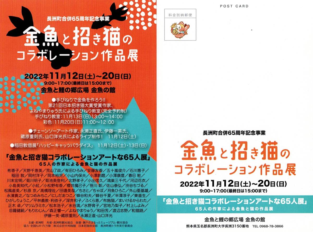 | ◆金魚と招き猫のコラボレーションアートな65人展◆ 時:2022年11月12日(土)〜20日(日) 9:00〜17:00(最終日は15:00まで) 所:金魚の館 〒869-0123 熊本県玉名郡長洲町大字長洲3150番地 tel 0968-78-3866 ※クリックすると大きな画像でご覧いただけます。 ※お陰様で終了しました、来場下さいました方有り難うございました。 |