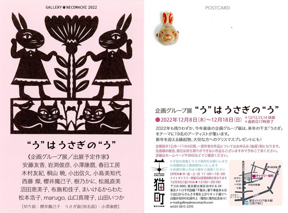 | ◆グループ企画展・"う”はうさぎの”う”◆ 時:2022年12月8日(木)〜12月18日(日) 12/12.13.14は休廊 11:00〜18:00(最終日17時まで) 所:ギャラリー猫町 〒110-0001東京都台東区谷中 2-6-24 03-5815-2293 来年は卯年ですね。 ウサギと猫はモフモフで同じくらいの大きさ。 というわけで猫に特化したギャラリー猫町にうさぎも登場です!(^^)/ 「ウは宇宙船のウ」という題名のレイ・ブラッドベリのSF短編集を 心躍らせて読んだ方にもオススメです♪ ※クリックすると大きな画像でご覧いただけます。 ※お陰様で終了しました、来場下さいました方有り難うございました。 |