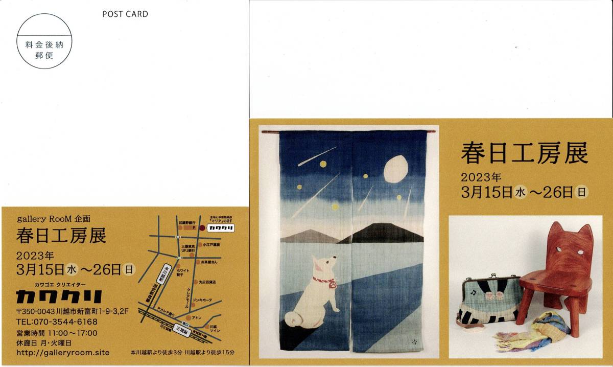 | ◆木工と染め春日工房展◆ 時:2023年3月15日(水)~26日(日) 11:00~17:00 所:gallery RooM 埼玉県川越市新富町1-9-3、2F tel:070-3544-6168 陶芸家のはらかおりさんが主催しているギャラリーで、 初めて個展をさせていただきます。 川越は趣のある古い町並みもあり、ギャラリーのある商店街も 活気があるので散策がてら是非お立ち寄りくださいませ! ※クリックすると大きな画像でご覧いただけます。 ※お陰様で終了しました、来場下さいました方有り難うございました。 |
