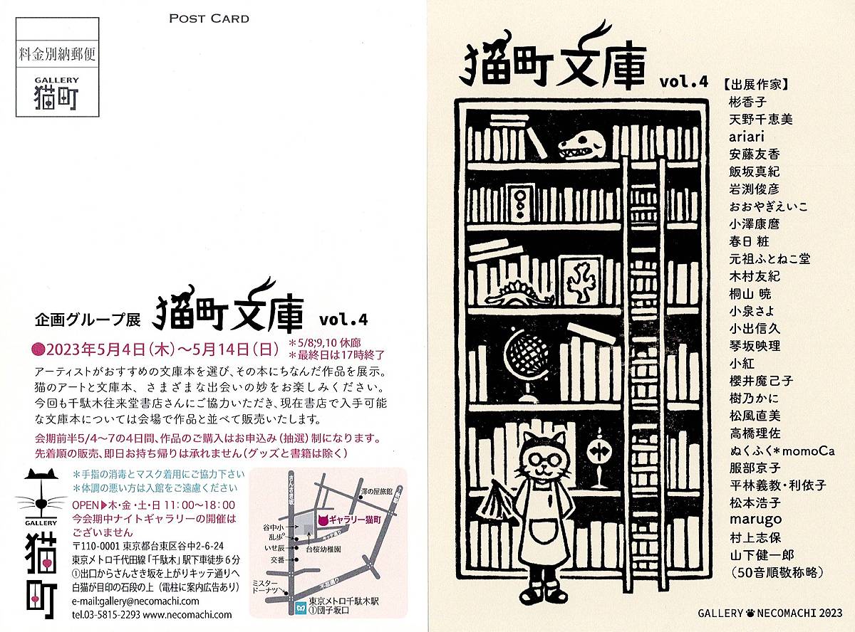| ◆企画グループ展・猫町文庫vol.4◆ 時:2023年5月4日(木)~5月14日(日) 5/8.・9・10は休廊 11:00~18:00 所:ギャラリー猫町 〒110-0001東京都台東区谷中 2-6-24 03-5815-2293 毎回大好評の猫町文庫。 作家一人が一冊自分の好きな文庫本を選んでその本と 猫ににまつわる作品を1~3点出品するという企画です。 春日粧は今回「下町洋食バー高野-捨て猫のプリンアラモード-」 (麻宮ゆり子著 ハルキ文庫)を選んで文庫本カバーを出品する予定です。 ※クリックすると大きな画像でご覧いただけます。 ※お陰様で終了しました、来場下さいました方有り難うございました。 |