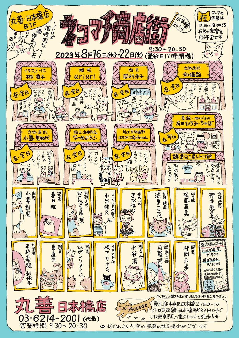 | ◆ネコマチ商店街◆ 時:2023年8月16日(水)~22日(火) 営業時間 9:30~20:30(最終日16:00まで) 所:丸善日本橋店 B1F イベントスペース 〒103-8245 東京都中央区日本橋2-3-10 TEL 03-6241-2001 今年のテーマは「昭和レトロ」です。 私(粧)は猫がレコード・けん玉・ダルマ落とし・おはじきなどと 戯れるデザインをしました♪ ※クリックすると大きな画像でご覧いただけます。 ※お陰様で終了しました、来場下さいました方有り難うございました。 |