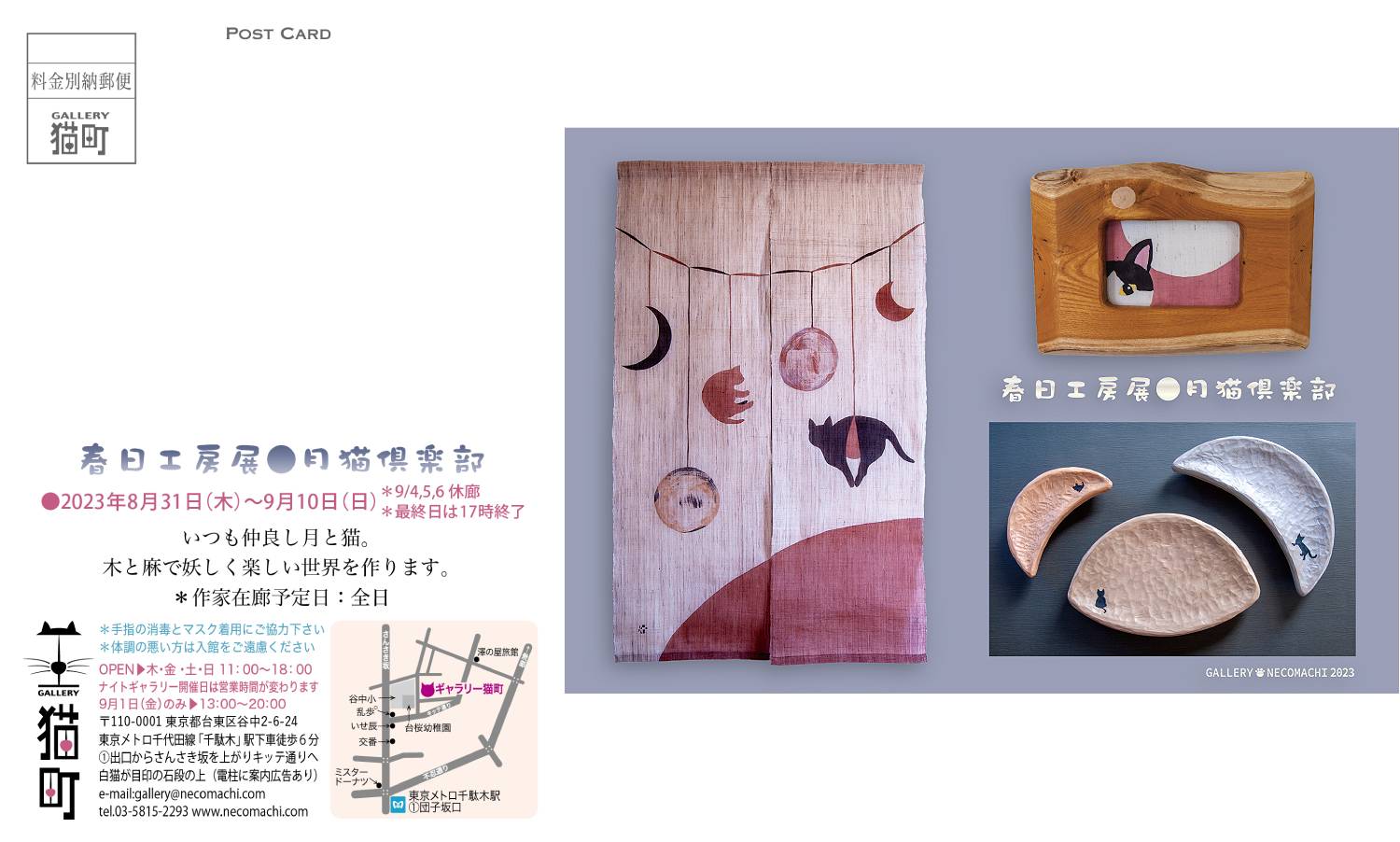 | ◆「月猫倶楽部(春日工房展)」◆ 時:2023年8月31日(木)~9月10日(日) 9/4・5・6は休廊 11:00~18:00 所:ギャラリー猫町 〒110-0001東京都台東区谷中 2-6-24 03-5815-2293 年に一度の谷中での工房展。 今年は大好きな月と猫のデザインをたっぷり揃える予定です。 ※クリックすると大きな画像でご覧いただけます。 ※お陰様で終了しました、来場下さいました方有り難うございました。 |