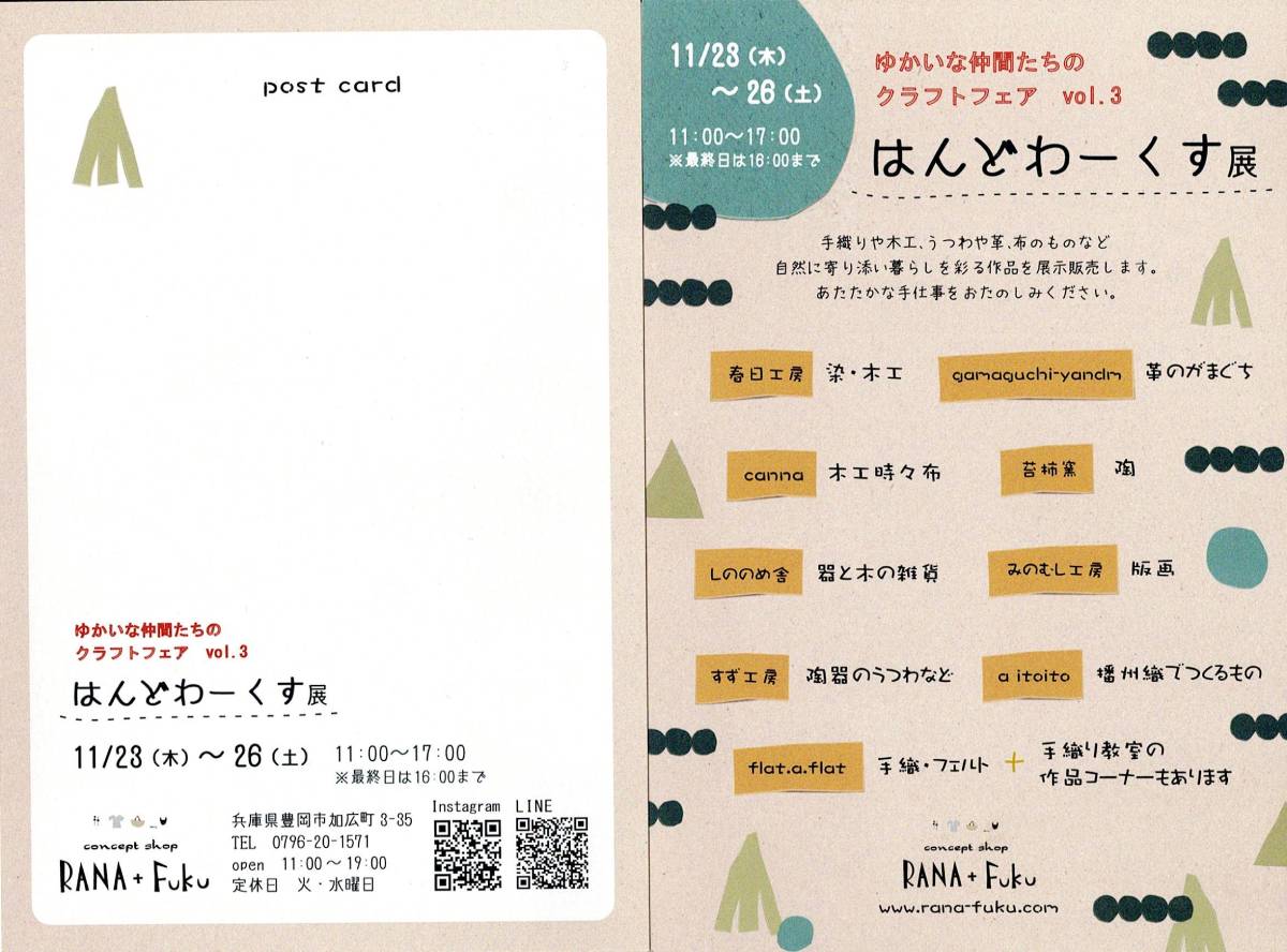 | ◆はんどわーくす展~ゆかいな仲間たちのクラフトフェア~vol.3◆ 時:2023年11月23日(木)~26日(土) 11:00~17:00(最終日16:00まで) 所:concept shop RANA+FuKu 兵庫県豊岡市加広町3-35 tel 0796-20-1571 手織りや木工、うつわや革、布のものなど 自然に寄り添い暮らしを彩る作品を展示販売します。 あたたかな手仕事をおたのしみください。 ※クリックすると大きな画像でご覧いただけます。 ※お陰様で終了しました、来場下さいました方有り難うございました。 |