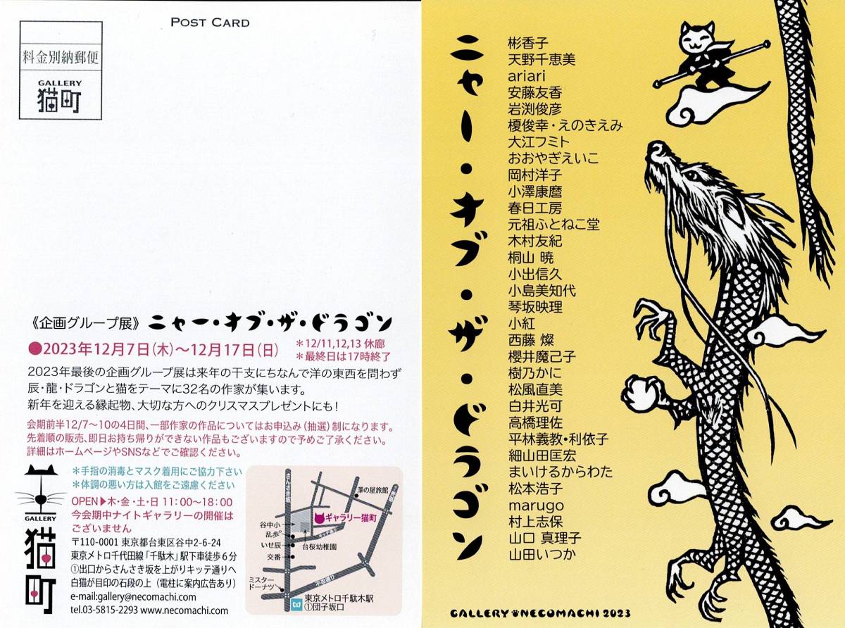| ◆企画グループ展・ニャー・オブ・ザ・ドラゴン◆ 時:2023年12月7日(木)~12月17日(日) 12/11,12.,13は休廊 11:00~18:00(最終日17時まで) 所:ギャラリー猫町 〒110-0001東京都台東区谷中 2-6-24 03-5815-2293 2023年最後の企画グループ展は来年の干支にちなんで 洋の東西を問わず辰・龍・ドラゴンと猫をテーマに32名の作家が集います。 新年を迎える縁起物、大切な方へのクリスマスプレゼントにも! ※クリックすると大きな画像でご覧いただけます。 ※お陰様で終了しました、来場下さいました方有り難うございました。 |