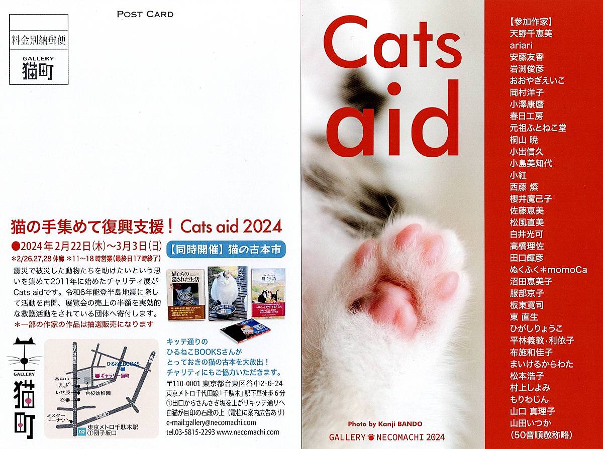 | ◆「猫の手集めて復興支援!Cats Aid 2024]◆ 時:2024年2月22日(木)~3月3日(日) 2/26.・27・28は休廊 11:00~18:00 所:ギャラリー猫町 〒110-0001東京都台東区谷中 2-6-24 03-5815-2293 今年の元旦に発生した能登半島大地震。 甚大な被害の中に含まれる動物たちの力に少しでもなりたい・・ と言うことで、東日本大震災に続いてチャリティ展が開かれます。 沢山の作家が心を込めて作品を作りますので、是非お買い上げいただき、 被災した動物たちへの力になって頂ければ、と願っております。 Cats AidのFacebookページ https://www.facebook.com/cat.aid/ ※クリックすると大きな画像でご覧いただけます。 ※お陰様で終了しました、来場下さいました方有り難うございました。 |