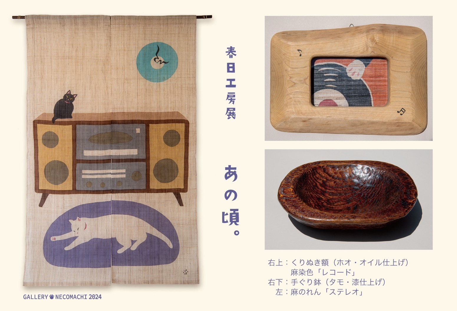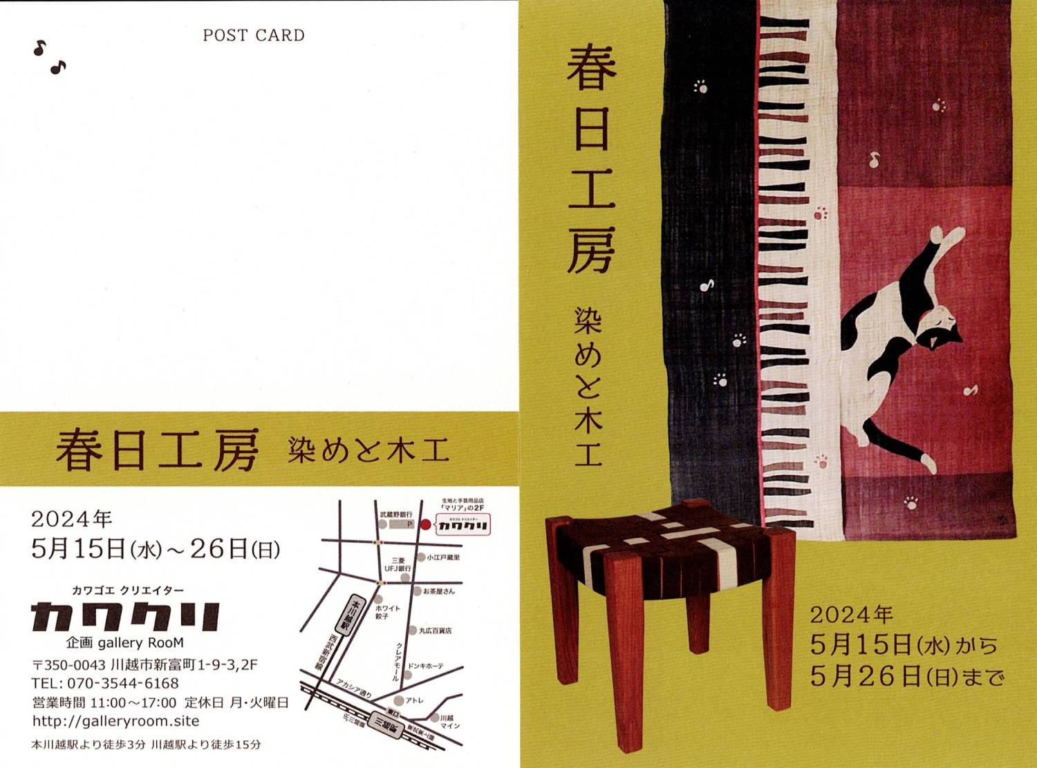 | ◆木工と染め春日工房展◆ 時:2024年5月15日(水)~26日(日) 11:00~17:00 所:gallery RooM 埼玉県川越市新富町1-9-3、2F tel:070-3544-6168 陶芸家のはらかおりさんが主催しているギャラリーで、 個展をさせていただきます。 川越は趣のある古い町並みもあり、ギャラリーのある商店街も 活気があるので散策がてら是非お立ち寄りくださいませ! ※クリックすると大きな画像でご覧いただけます。 ※お陰様で終了しました、来場下さいました方有り難うございました。 |