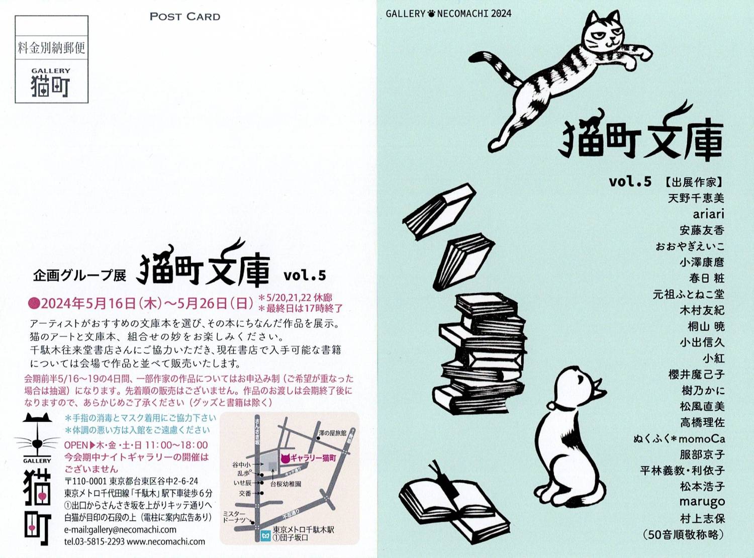 | ◆企画グループ展「猫町文庫vol.5」◆ 時:2024年5月16日(木)~5月26日(日) 5/20.・21・220は休廊 11:00~18:00 所:ギャラリー猫町 〒110-0001東京都台東区谷中 2-6-24 03-5815-2293 毎回大好評の猫町文庫。 作家一人が一冊自分の好きな文庫本を選んでその本と 猫ににまつわる作品を1~3点出品するという企画です。 ※クリックすると大きな画像でご覧いただけます。 ※お陰様で終了しました、来場下さいました方有り難うございました。 |