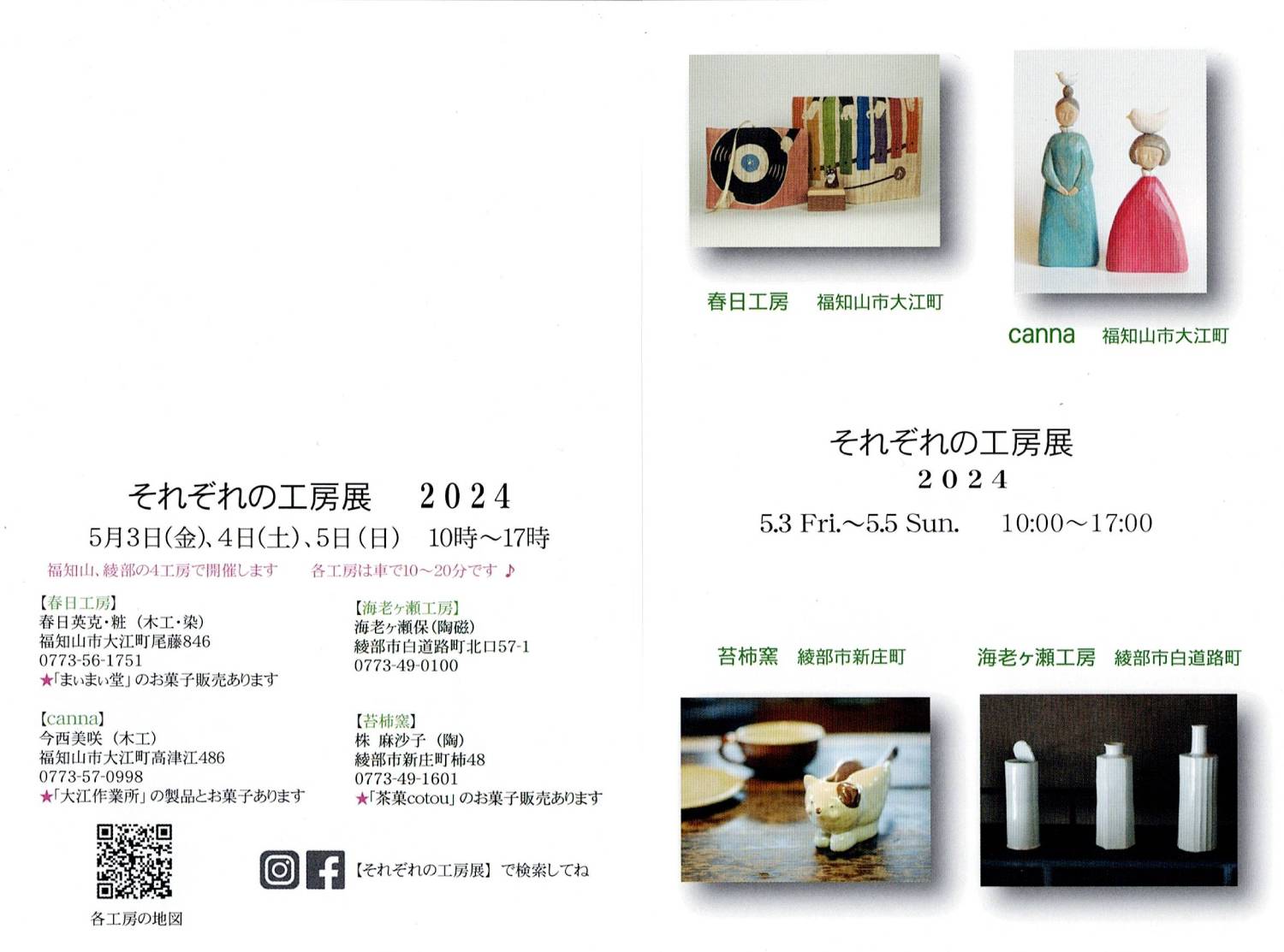| ◆それぞれの工房展◆ 時:2024年5月3日(祝)~5日(祝) 10:00~17:00 所:春日工房自宅ほか綾部市・福知山市のそれぞれの工房・自宅で 行う工房展です。今年は、福知山で2工房、綾部で2工房の 合計4工房で開催します。詳しい地図は下記にpdfファイルにて リンクします、ダウンロードして活用ください。 ※クリックすると大きな画像でご覧いただけます。 ![]() ※クリックするとpdfファイルで開きます。 ※お陰様で終了しました、来場下さいました方有り難うございました。 |