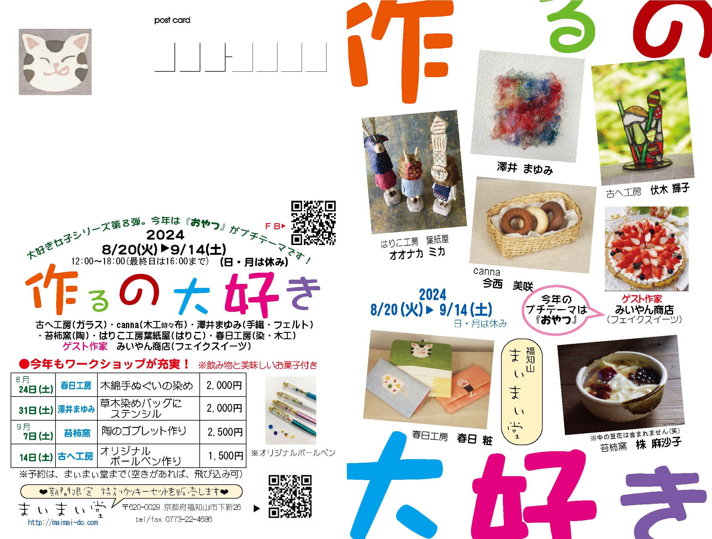 | ◆作るの大好き「大好き女子」第8弾◆ 時:2024年9月20日(火)~10月14日(土) (日・月曜日は休み) 所:まぃまぃ堂 京都府福知山市下新26 TEL 0773-22-4686 様々なジャンルの女性作家ばかり6名で催している「大好きシリーズ」 今年のプチテーマは「おやつ」です。 ※クリックすると大きな画像でご覧いただけます。 ※お陰様で終了しました、来場下さいました方有り難うございました。 |