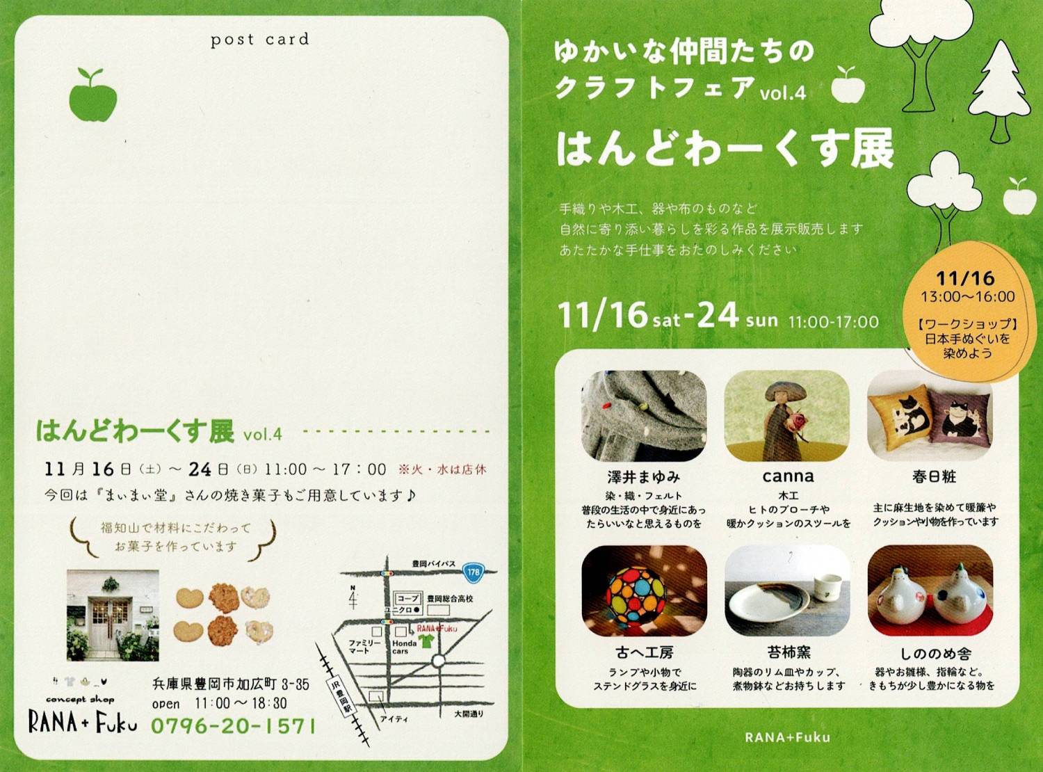 | ◆はんどわーくす展~ゆかいな仲間たちのクラフトフェア~vol.3◆ 時:2024年11月16日(土)~24日(日) 11:00~17:00(最終日16:00まで) 所:concept shop RANA+FuKu 兵庫県豊岡市加広町3-35 tel 0796-20-1571 手織りや木工、うつわや革、布のものなど 自然に寄り添い暮らしを彩る作品を展示販売します。 あたたかな手仕事をおたのしみください。 ※クリックすると大きな画像でご覧いただけます。 ※お陰様で終了しました、来場下さいました方有り難うございました。 |
