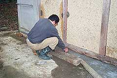 初め、母屋と土蔵の間にあった物置は取り壊してしまったのですが、そのために出来る水たまりで母屋の土台が濡れるので、コンクリートで嵩上げしました。 |