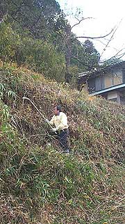 石垣の横にあるガケは角度が急なのと、夏は蜂の巣があって怖いので、つい草刈りをサボッていましたが、スパイク付きの長靴をはいて思い切って刈りました。(高所恐怖症のため、ちょっとヘッピリ腰) |