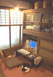 毎日こんなところでパソコンを使っています。古い家に現代機器は似合わないので、熱がこもらないように戸棚の裏に穴を開けてパソコンを入れ、使わない時は戸を閉めています。ウサちゃん(15歳♀)はホットカーペットのついているこの場所が大好きです。 |