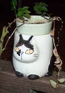 フリーマーケットで100円で売られていたマグカップ の彼女。植木鉢カバーとなった今でも、猫らしい 細い黒目は健在です。 |