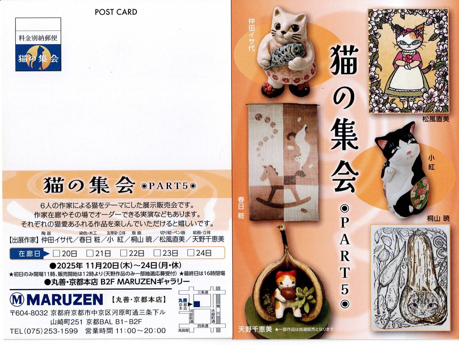 | ◆猫の集会-PART5-◆ 時:2025年11月20日(木)~24日(月・休) ★初日のみ開場11時、販売開始は12時より (天野作品のみ一部抽選応募受付) ★最終日は16時閉場 所: 所:丸善京都本店 B2F MARUZENギャラリー 〒604-8032 京都市中京区河原町通三条下ル山崎町251 京都BAL TEL075-253-1599 営業時間 11:00~20:00 【出展作家】〇陶器・・・ 仲田イサ代 〇染色・木工・・・春日粧 〇友禅染・立体・・・小紅 〇版画・・・ 桐山暁 〇切り絵・ペン画・・・松風直美 〇絵画・立体・・・天野千恵美 6人の作家による猫をテーマにした展示販売会です。 作家在廊やその場でオーダーできる実演などもあります。 それぞれの猫愛あふれる作品を楽しんでいただけると嬉しいです。 ※クリックすると大きな画像でご覧いただけます。 |