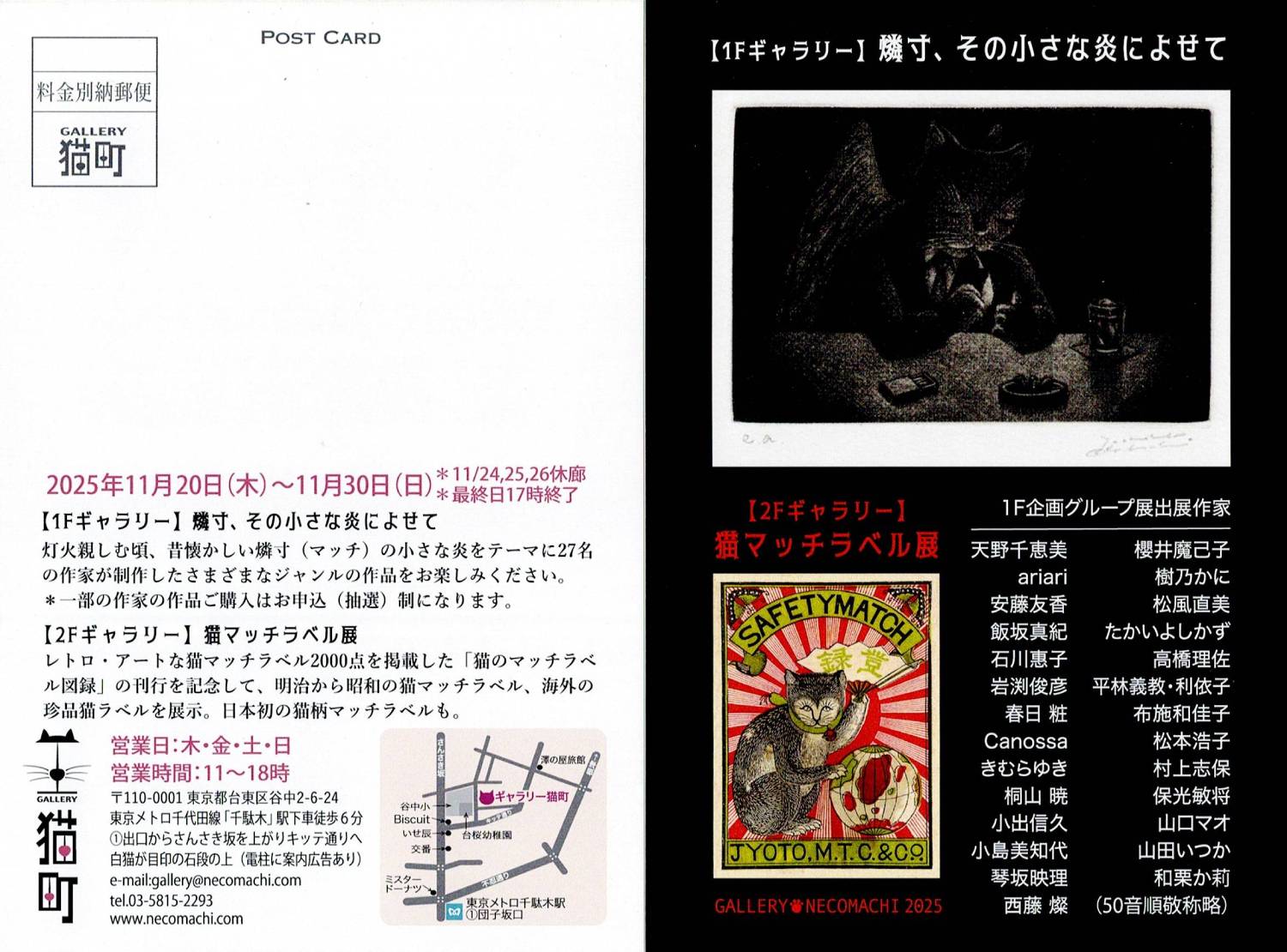 | ◆企画グループ展「燐寸(マッチ)、その小さな炎によせて」◆ 時:2025年11月20日(木)~11月30日(日) 月・火・水は休廊 11:00~18:00 所:ギャラリー猫町 〒110-0001東京都台東区谷中 2-6-24 03-5815-2293 、猫マッチラベル図録刊行記念「猫のマッチラベル展」に合わせた 燐寸(マッチ)と猫をテーマにしたグループ展です。 灯りの恋しくなる季節ですので是非お立ち寄り下さいませ。 ※クリックすると大きな画像でご覧いただけます。 |