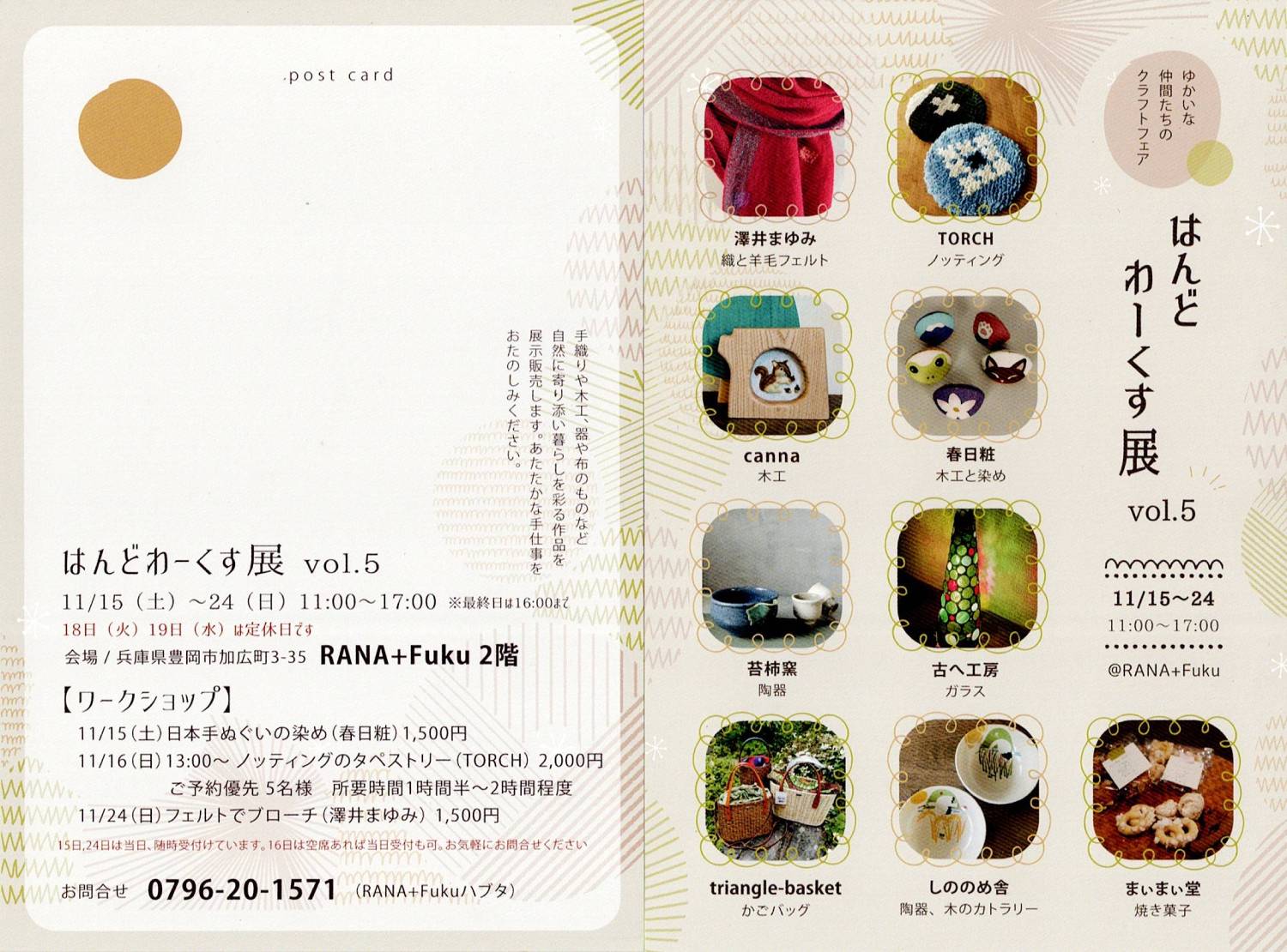 | ◆はんどわーくす展~ゆかいな仲間たちのクラフトフェア~vol.4◆ 時:2025年11月15日(土)~24日(月) 11:00~17:00(最終日16:00まで) 所:concept shop RANA+FuKu 兵庫県豊岡市加広町3-35 tel 0796-20-1571 手織りや木工、うつわや革、布のものなど 自然に寄り添い暮らしを彩る作品を展示販売します。 あたたかな手仕事をおたのしみください。 ※クリックすると大きな画像でご覧いただけます。 |