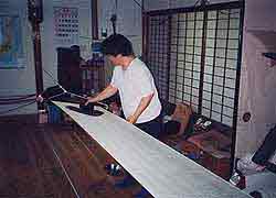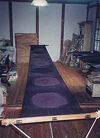 A4.染め1回目 張り木で布をくわえ、部屋(8畳2間)の端から端まで張り、ろうを置いていない部分を染めます。 |