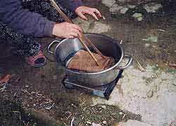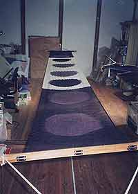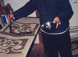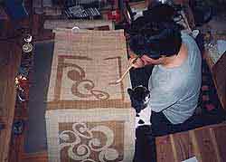 A2.ろう置き 布に大きな「しんし 」(両端に針の出た竹の棒)を張り、図案に沿って「ろう」を置いていきます。私はろうを電気天ぷら鍋を使って溶かしています。時々ネコが邪魔をしてくれます。コラッ! |