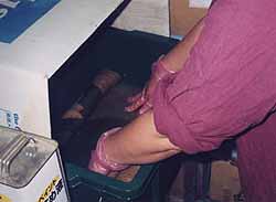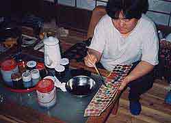 A9.水洗い 反応剤と余分な染料を落とすために、色が出なくなるまで水洗いとお湯洗いをします。完全に色が出なくなったら色落ち防止液に10分くらいつけます。その後20秒くらい脱水機にかけてから、まだ濡れているうちに高温のアイロンをかけて乾かします。そうすると麻の持っている特性により、糊などをつけないでもパリッと仕上がります。 |
