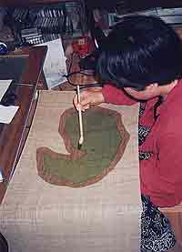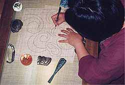 当然ですが、作る作品のデザインはすべて「オリジナル」です。 まずスケッチをして(抽象柄は頭に浮かんだイメージを紙に描いて) 少しずつデフォルメしていきます。 ![]() A1.下描き ガラスをはめた机の下から光を当てて図案を描いた紙を置き、その上に麻の布を置き、6Bの鉛筆でなぞっていきます。鉛筆の跡は染めていく過程でほとんど消えます。周囲に散らばっているのは布を押さえるための文鎮です。 |