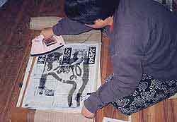 A6.ろう落とし(アイロン) 染めが終わったらろうを落とします。溶剤で洗う前に新聞紙の間に染め布 をはさみ、アイロンを当てて、大まかなろうを取っておきます。 |