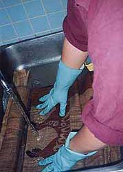 A7.ろう落とし(溶剤) 風通しの良い屋外で染め布を溶剤につけてろうを落とします。溶剤を新しいものにとり変えて2回以上繰り返し、完全にろう分を落とすようにします。 |